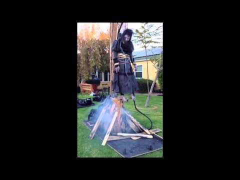 Plug & Play! All of our pneumatic (air powered) props come complete and ready to run with programmed controller, motion sensor, intense audio, and speakers. Included with this prop are the wood stake, metal base stand, fake fire, and fog machine. Foot print for rig is 46" d x 40" w x 110" h.