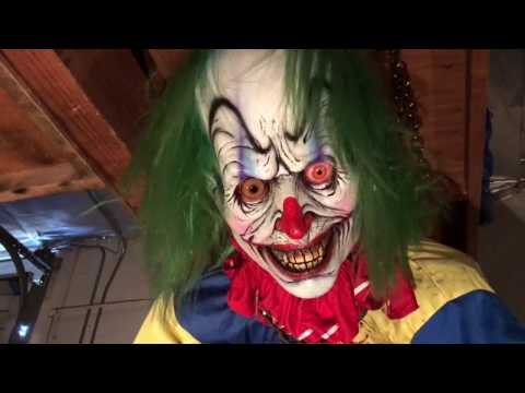 Suspended clown with hands holding on to his own guts flailsĀ and grabs, flinging guts at patrons, while head thrashes.