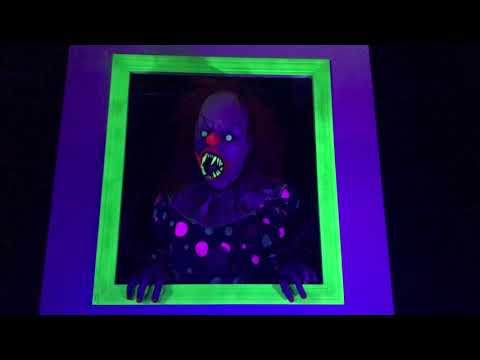 Evil Clown hides below broken window then shoots straight up and out of window with multiple head movement.