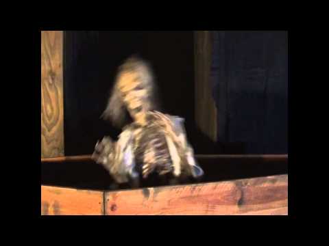Skelly corpse lays in coffin, then corpse sits up and turns at patrons shaking.