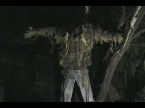 Scarecrow waits with head down then arms & body thrash & flail, then head lifts as he flies out 8' wildly thrashing arms.