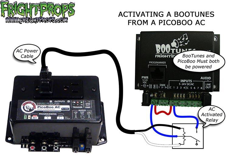 This diagram illustrates how to fire off a BooTunes with a PicoBoo AC (105). When output 1 is activated the BooTunes will play the input 1 MP3 file. You can also share output 1 on the PicoBoo AC with other 110v devices by using a power strip.