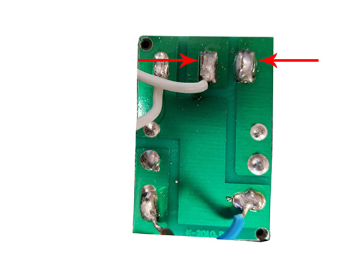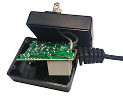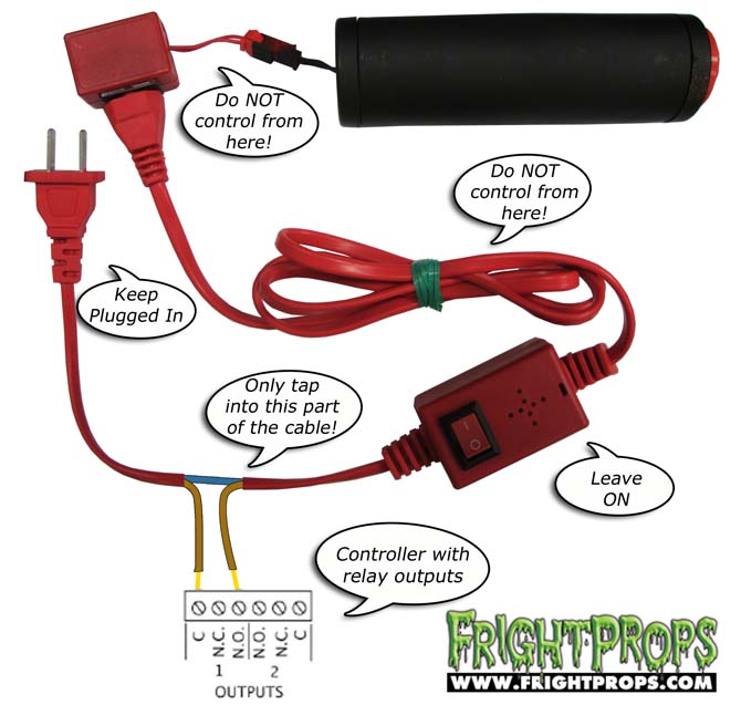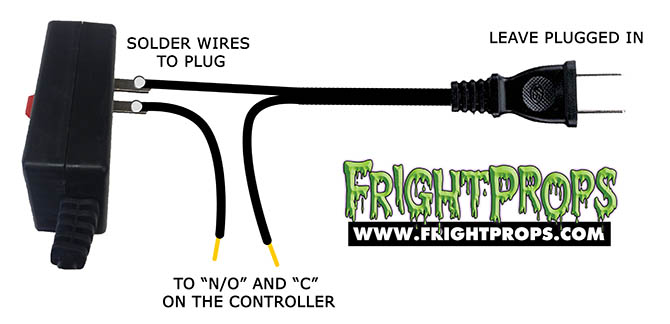 If you are using a controller or relay that does not have 110v AC outlets on it you will need to tap into the AC power cable to activate as shown in the images below. The controller will turn the FLASH! Cracker ON and OFF by contacting the two wires. Our PicoBoo JR, PicoBoo, BooBox Flex with Relay Accessories, and Wireless Remotes will all operate the FLASH! Cracker this way.