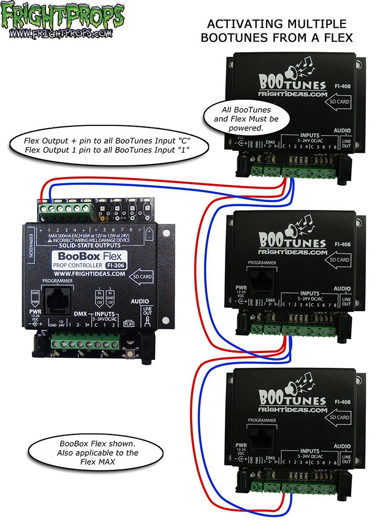 As of October 2011 you can activate one or more BooTunes from the Flex or Flex MAX controller by using the DMX outputs. This allows you to not have to use one of the outputs to trigger the BooTunes and simplifies the wiring. You must have the latest firmware for both the Flex and BooTunes in order for this to work.