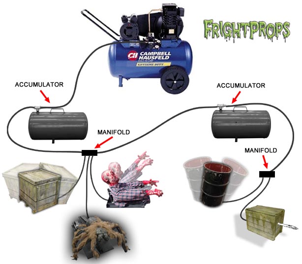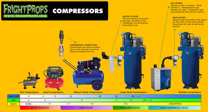 Our air powered (pneumatic) props and air blasters require an air compressor to operate. Compressors come in a variety of sizes and specifications. This document will help you to determine the best compressor for your Halloween prop needs.