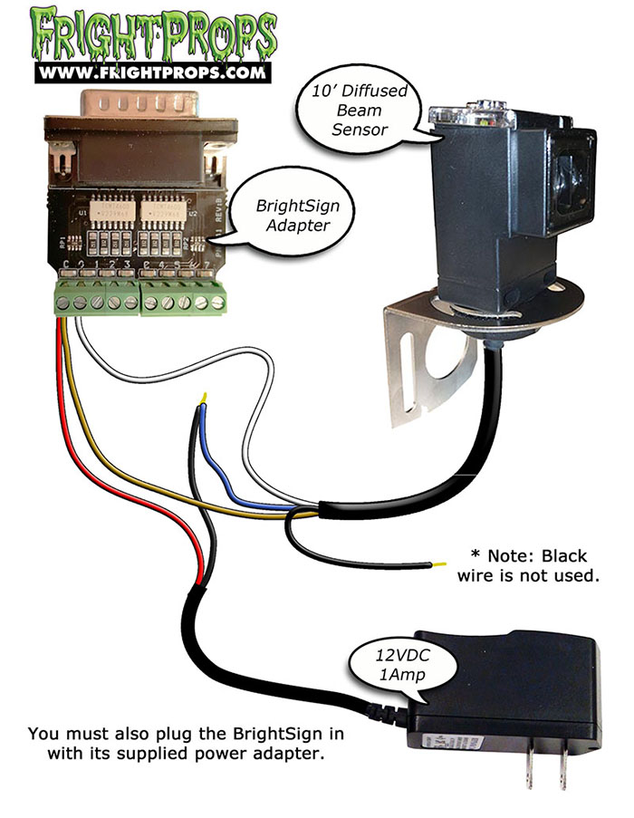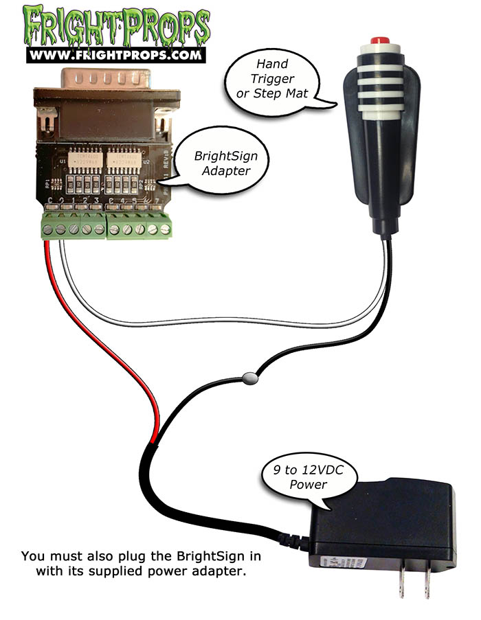 Activating the BrightSign LS422 Digital Video Player from a trigger (such as motion sensor) or controller requires the optional Input Adapter. The diagrams on this page illustrate how to wire into that adapter.