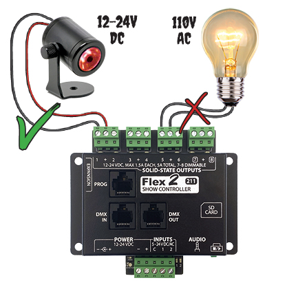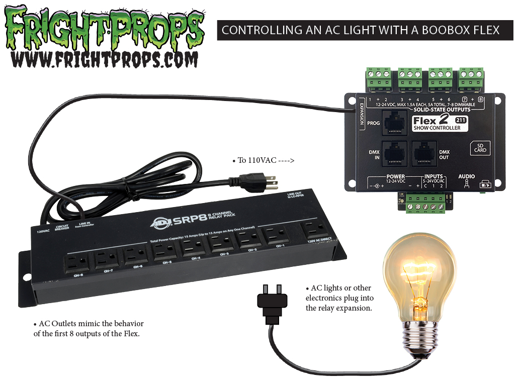 There are options that allow you to easily control 110v lights (or other 110v electric devices) using a Flex. The easiest way is to use a relay expansion board. We offer On/Off AC Relay and Dimmable AC Relay expansions that make controlling 110v AC devices with your BooBox Flex or FlexMax a breeze!