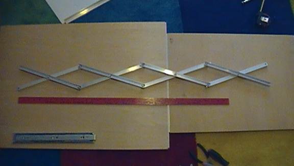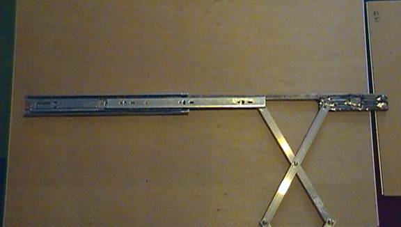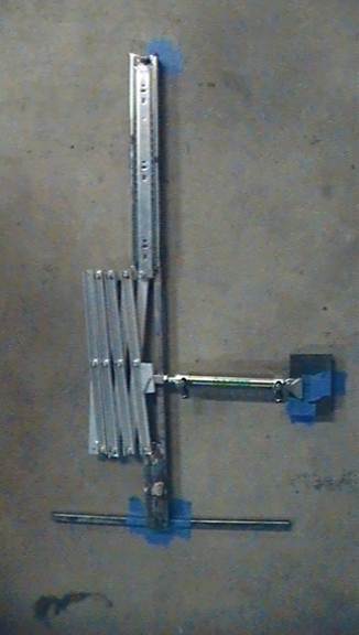 Bolt your scissor mechanism to the slider and the stationary hole. Use the same principal as before, keep the lock nuts just loose enough to let thing rotate freely. You’ll have to use multiple lock nuts and/or washers to space the scissor mechanism from the drawer slider properly.