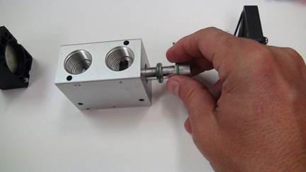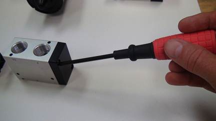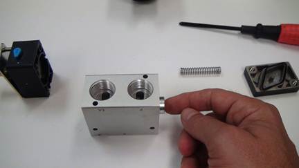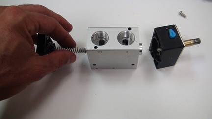 Re-install the top using the two Phillips head screws. Important: See that little hole in the valve body (smaller than the screw hole)? Make sure the similar sized small hole in the black part matches up with that.