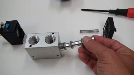 Carefully push the piston through the valve body. Remove the large spring.