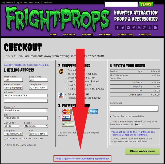To obtain a sales quote before you place an order you can simply add products to your cart, go to checkout and enter your address. Then click on the link that says "Need a quote for your purchasing department?". You will be presented with a quote/performa invoice that you can print out. Please note that FrightProps does not receive a copy of this - it is only for your use. When ready to place the order you can do so on the site by submitting the order.