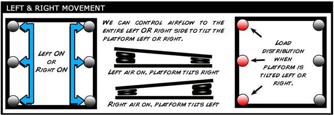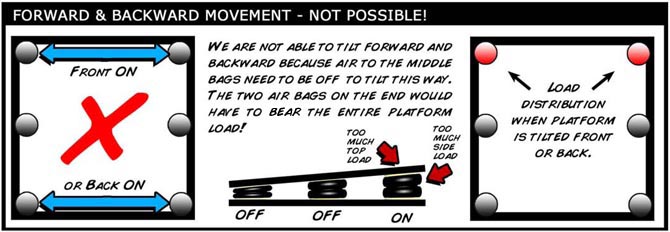 Once the motion platform goes beyond a certain size (about > 5' x 5') the forward & backward tilt is not possible. This is because small platforms only require four air bags (one on each corner) . Once the platform design goes beyond four air bags we lose the ability to tilt forward & backward. The diagrams provide a simplified explanation for this limitation.