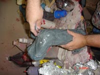 ![]() Immediately pour latex out of mold. Let dry overnight. If you will be making a hollow prop (such as a mask or glove) you can fill and pour out again to get a thicker skin. This is not necessary if you will be filling with foam. |
