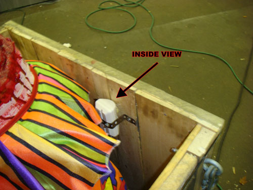The pictures show one mounted behind a hole in one of our Creature Crates. We screwed a piece of pipe strapping steel tape to the back of the PIR to hold it in place.