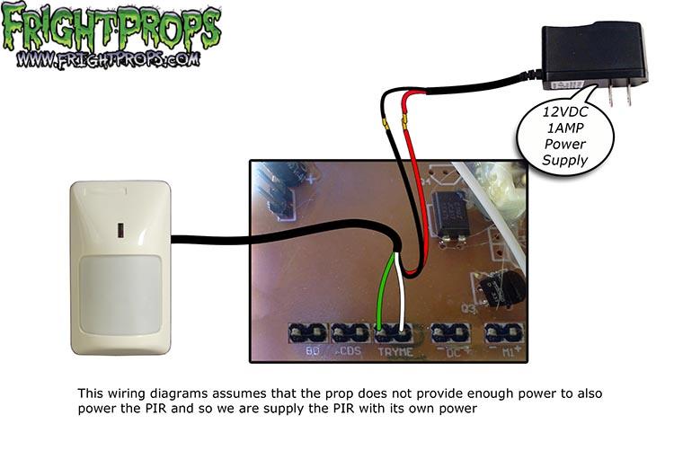 First try installing the PIR as shown in this diagram. If this does not work it is because sometimes the budget prop does not supply enough power for the PIR. In that case you will have to supply power to the PIR using a separate power supply (12V 1AMP) as shown in the second diagram.