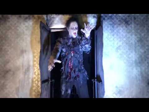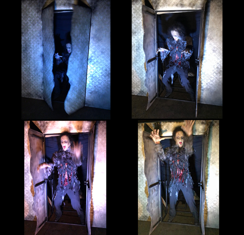 Wall splits open and Ghoul burst up and out to 7' tall while arms flail and grab. Head has multiple movement.