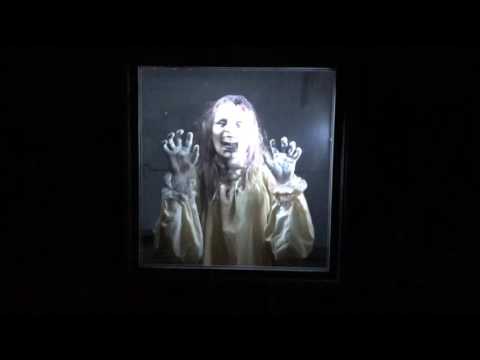Bloody Mary hides behind mirror, then lights switch and she appears behind mirror slamming against glass while head turns side to side.