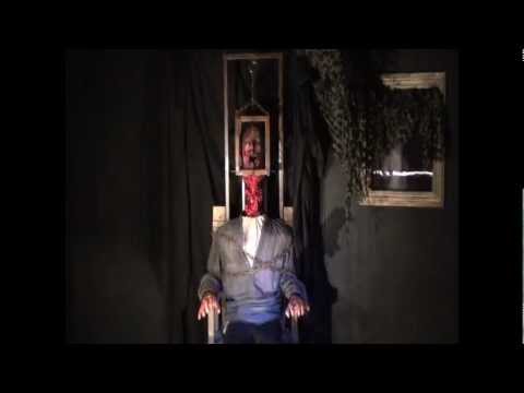 Victim sits strapped in chair with head trapped in metal box, then chain engages pulling box up ripping head and spine 12" out of body!
