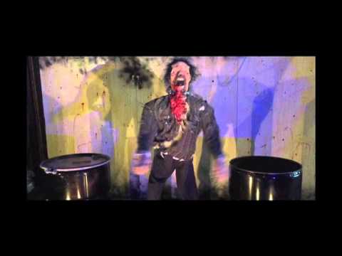 Chained Zombie waits with head down, then torso, head and arms lift while zombie twitches from left to right grabbing at patrons!