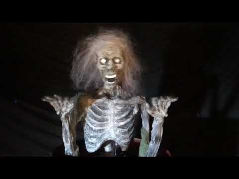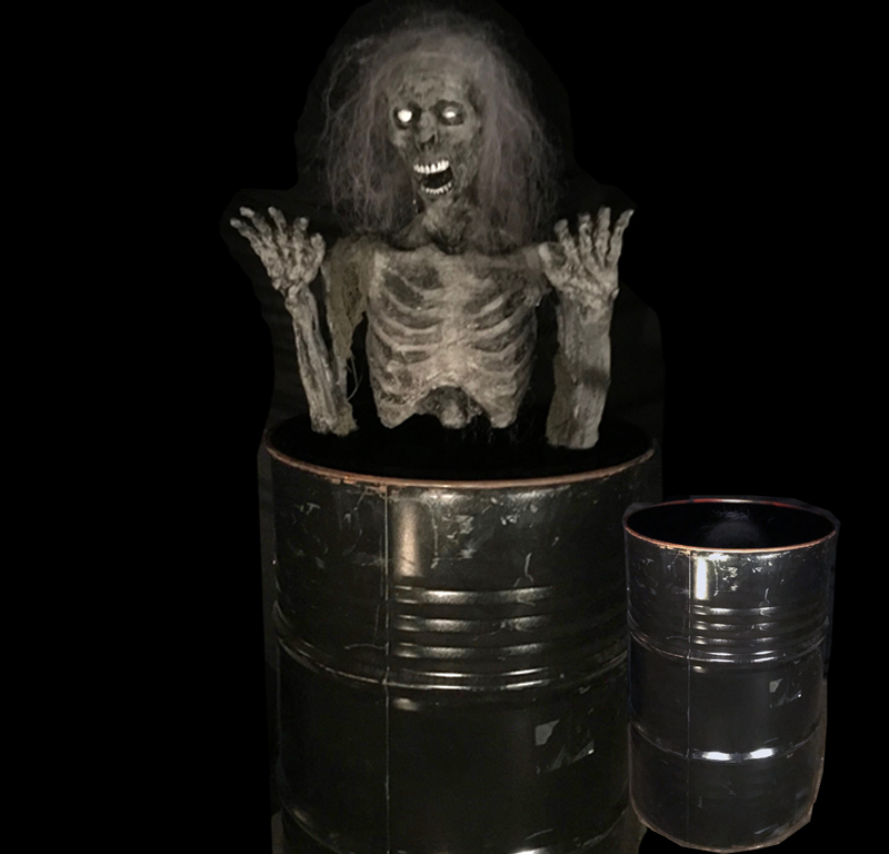 Skelly corpse waits inside inconspicuous barrel, then skelly pops up 25″ then lunges forward grabbing at patrons.
