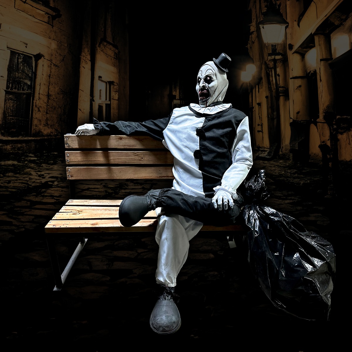 This animated photo op comes with bench and terrifying clown. Great for promoting your haunted event or party! Human not included (provide your own...lol!)