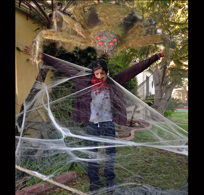 Victim struggles, legs jump and kick, while a giant spider comes down from above to attack victim and patrons!