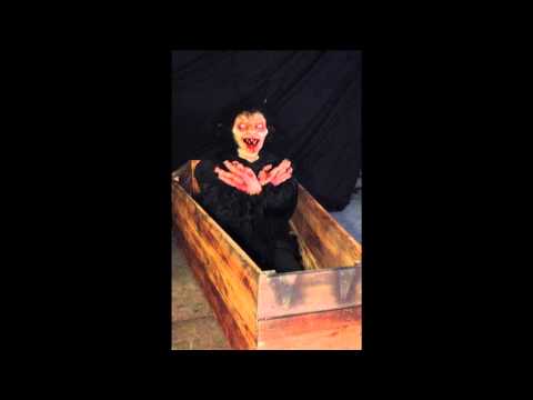 Vampire corpse lays in coffin, then corpse sits up looks at patrons shaking.