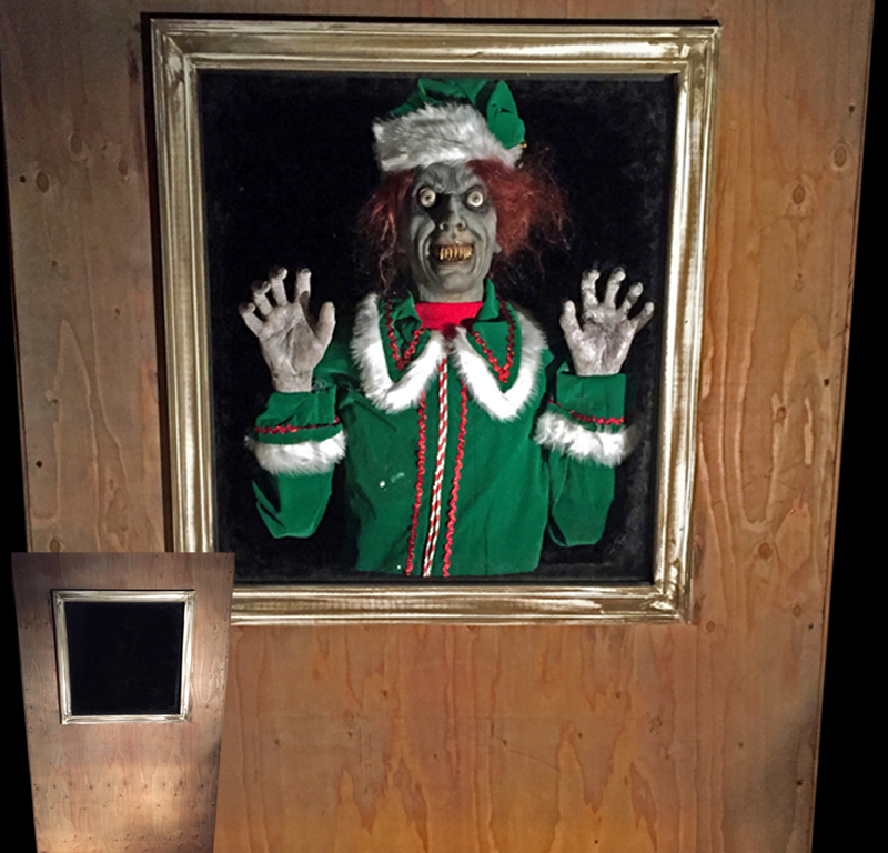 Elf waits behind plexiglas, then flies up and slams and bangs against Plexiglas creating a very startling effect.