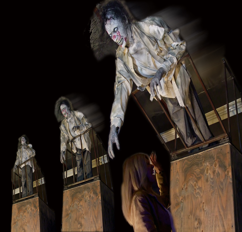 Zombie leans over, arms grabbing before rail breaks away and falls 32". Arms and torso move and grab. A Great element of surprise.