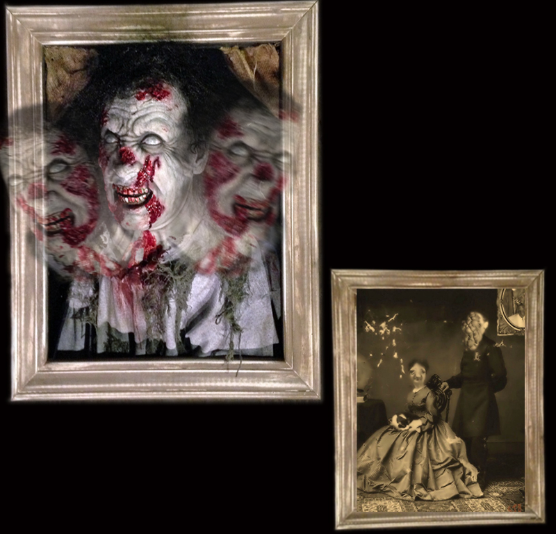 Portrait drops exposing a horrible ghoul, then ghoul lunges forward with head turning side to side and up and down.